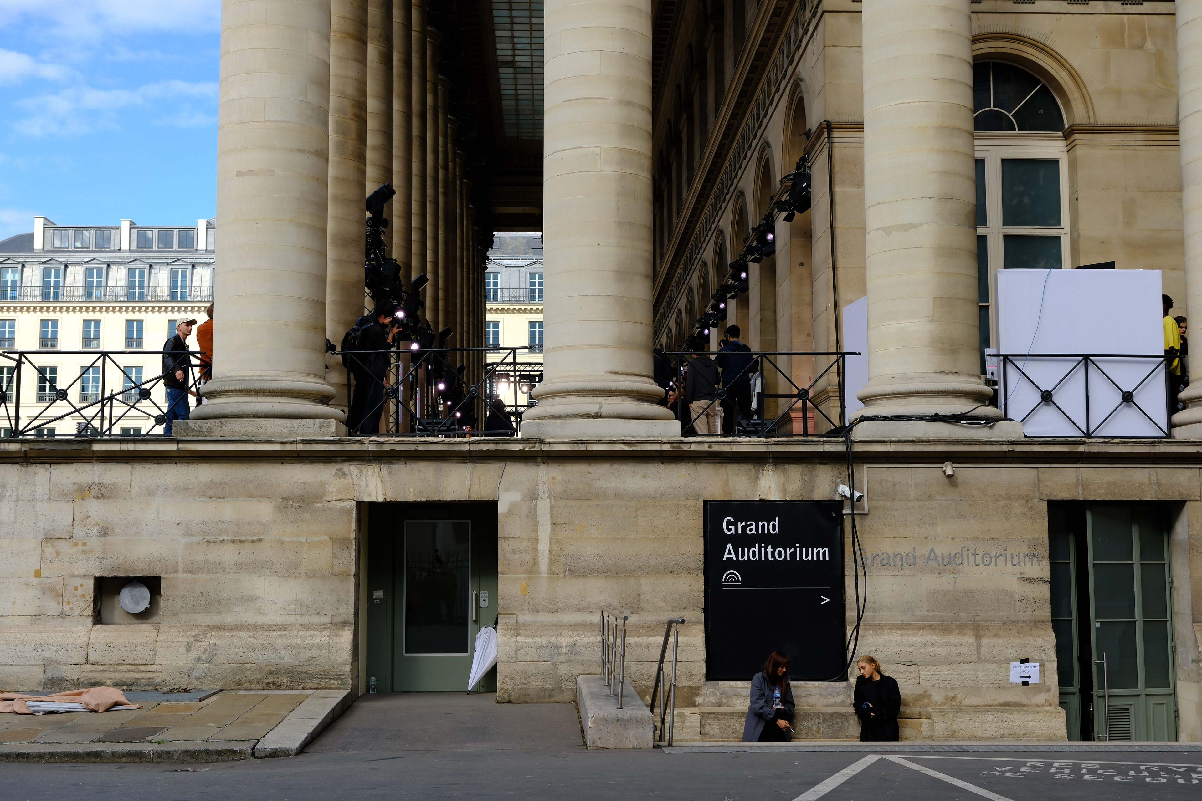Side facade of Palais Brongniart before the start of the fashion show, Paris, September 28, 2024.